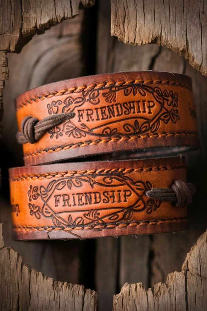 Purchase a leather stamping kit and imprint words or symbols that hold significance in your friendship, such as the date you met, a shared quote, or simple icons like hearts or stars.
