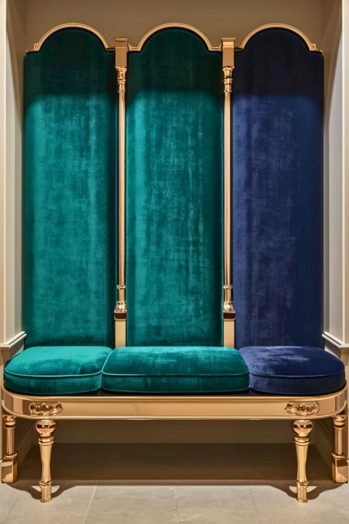 Elevate your mudroom’s aesthetics with a luxe velvet-covered bench. Choose a bold color like emerald green or deep navy to make a chic statement. The velvet texture adds sophistication and comfort.
