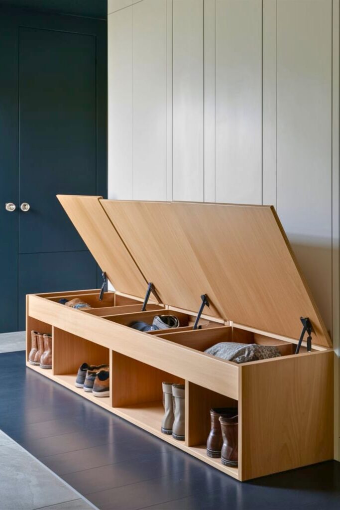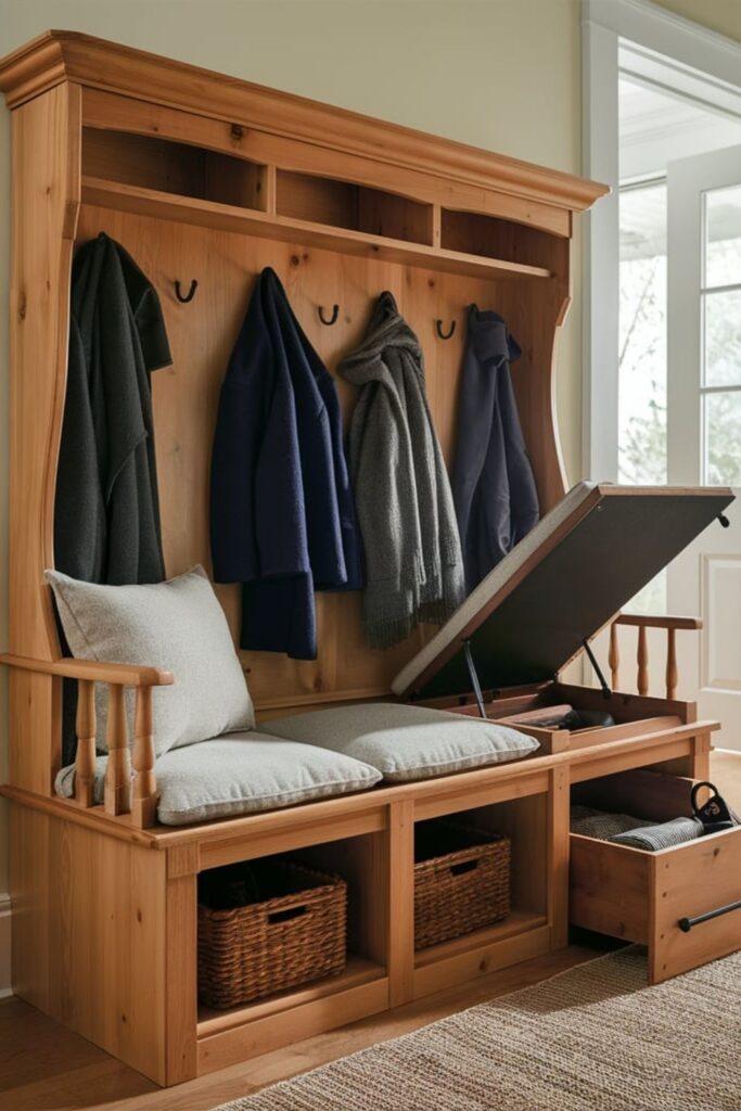 A bench with built-in storage cubbies or drawers underneath is ideal for keeping hats, gloves, and scarves organized.