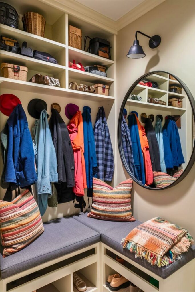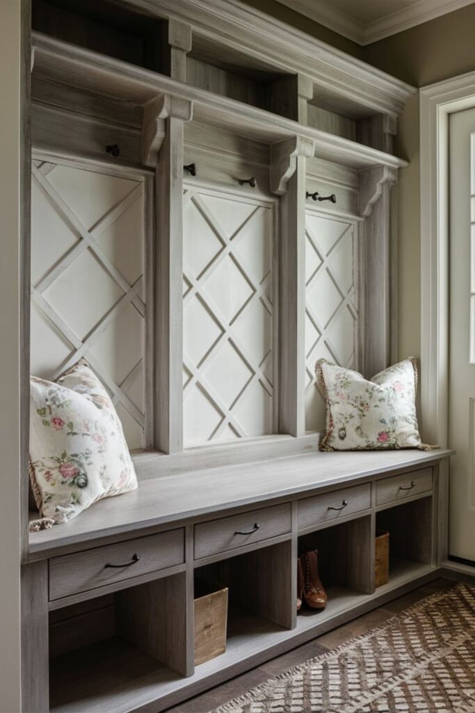 Complete the look with floral or gingham-patterned cushions, making your mudroom both inviting and functional.