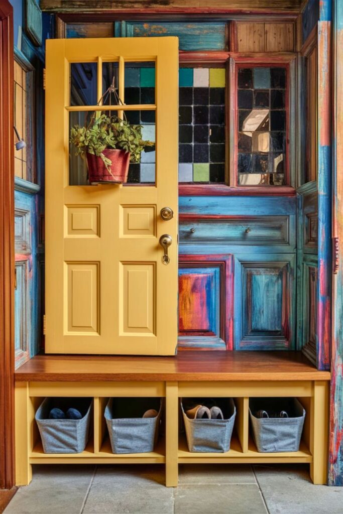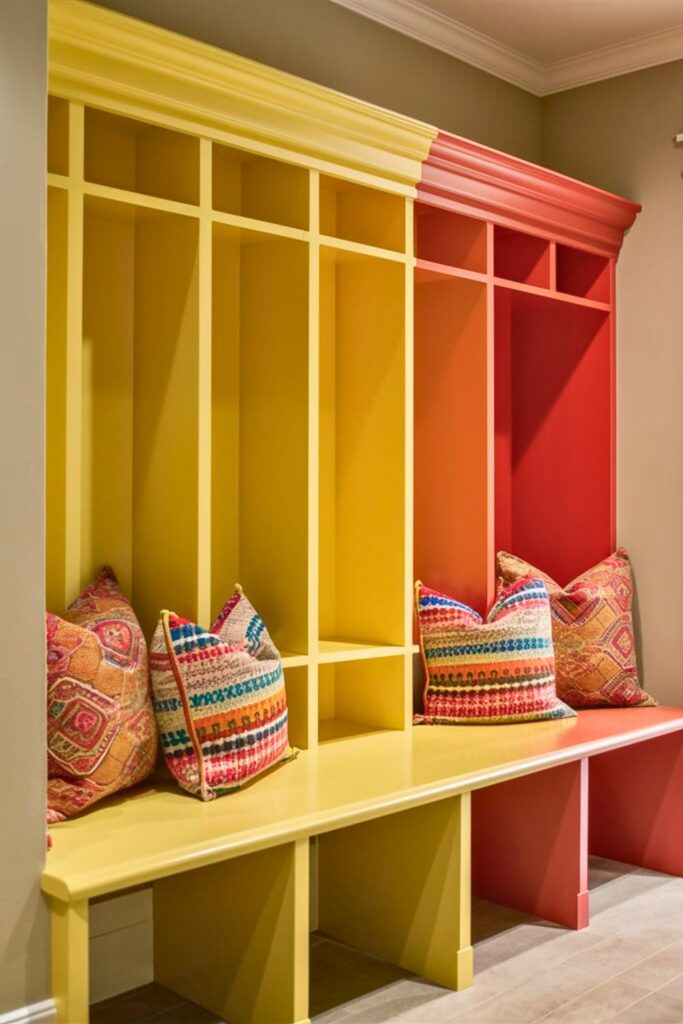Inject a burst of color into your mudroom with a vibrant entry bench. Opt for eye-catching hues like yellow or red to create a standout piece, contrasting beautifully with neutral room tones.