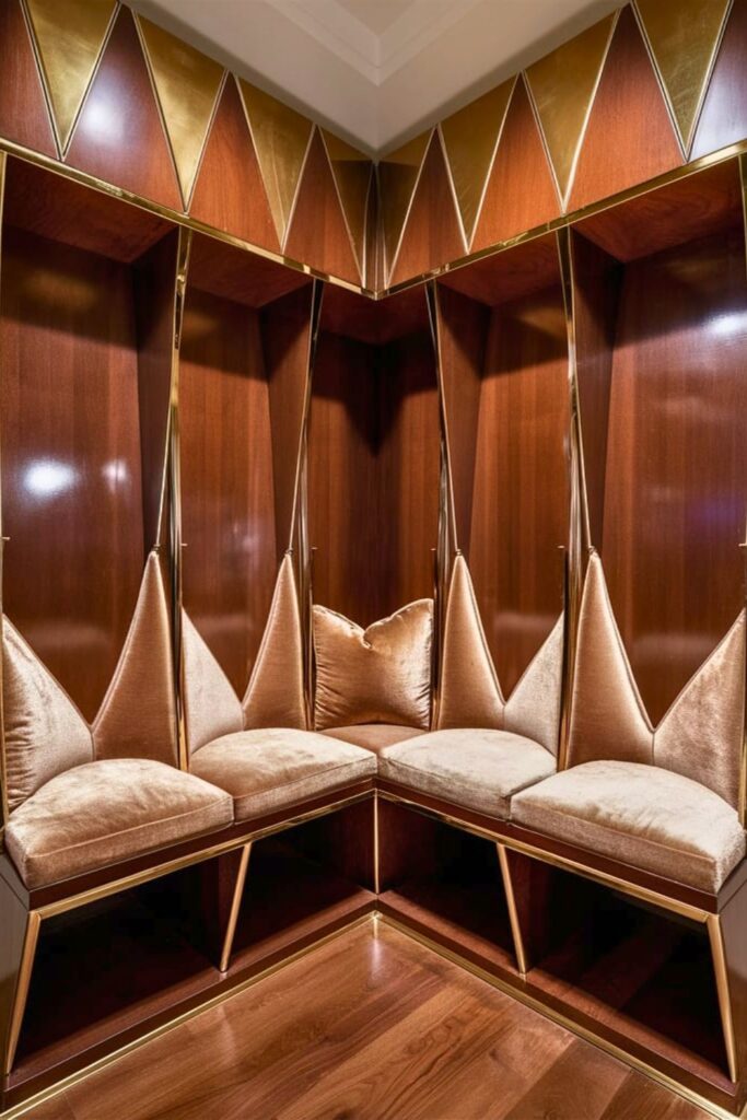Add a touch of glamour to your mudroom with an Art Deco inspired bench. Incorporate geometric shapes and luxurious materials like polished wood, glass, and metal accents for a sophisticated look.