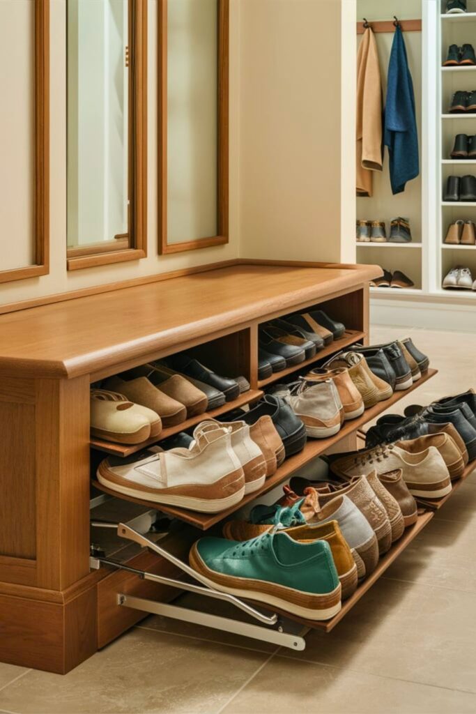 Efficiency meets style with a bench featuring slide-out shoe racks. This design utilizes the space beneath the bench to store multiple pairs of shoes, which can be easily accessed when needed.
