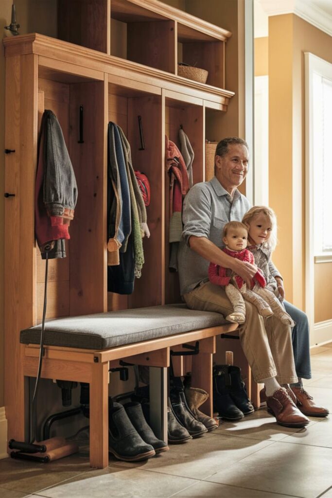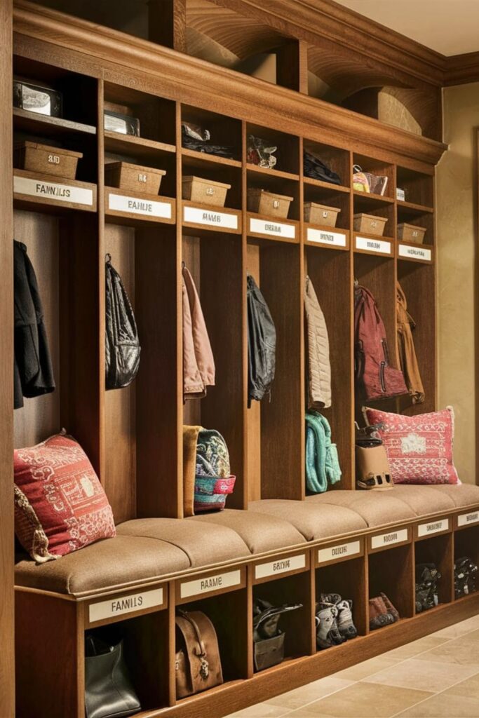 A cubby storage bench is a practical choice for families. Design the bench with multiple cubbies underneath, each assigned to different family members.