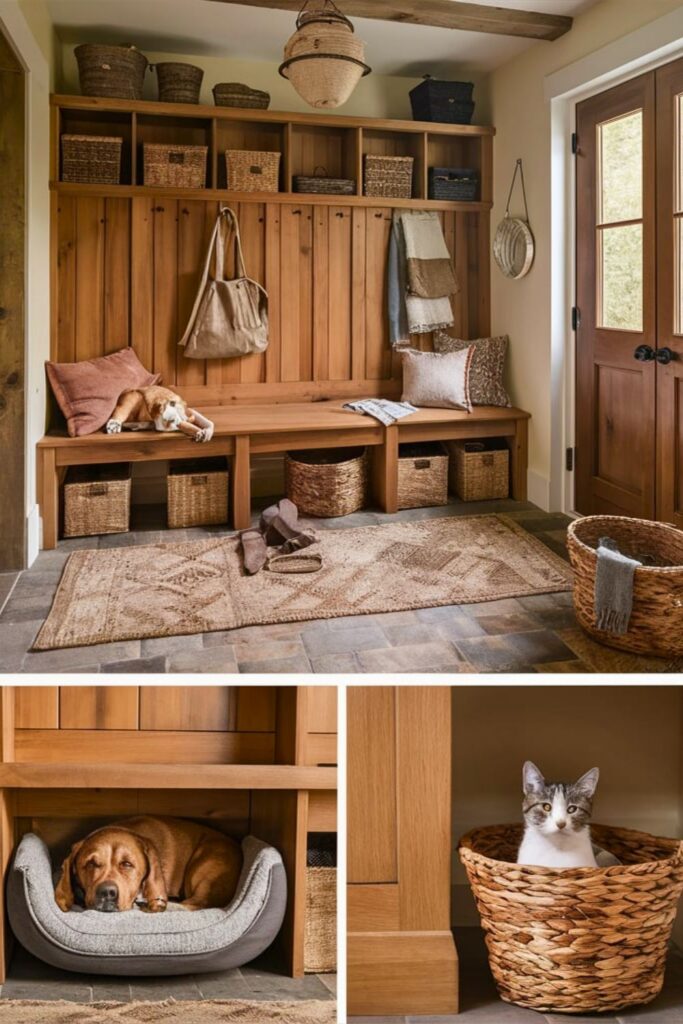 Make your mudroom pet-friendly by integrating a pet bed into your bench. Design a small cubby or drawer at one end of the bench for your furry friend to snuggle into.