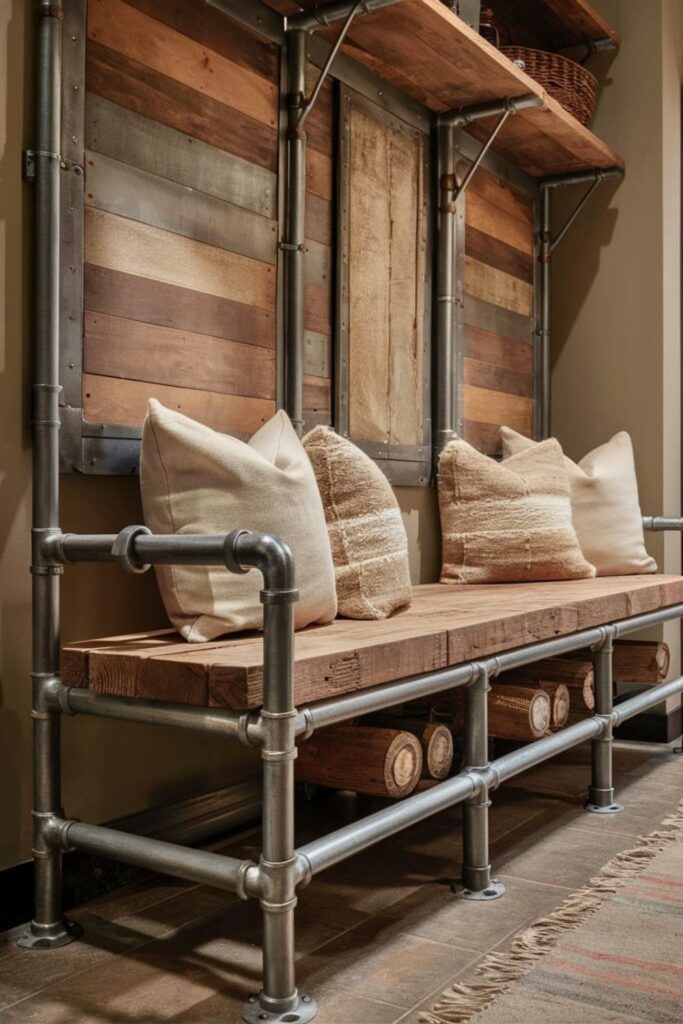 An industrial pipe mudroom bench brings a trendy, urban feel to any home. Construct the frame from metal pipes, connecting them with elbow joints for stability.