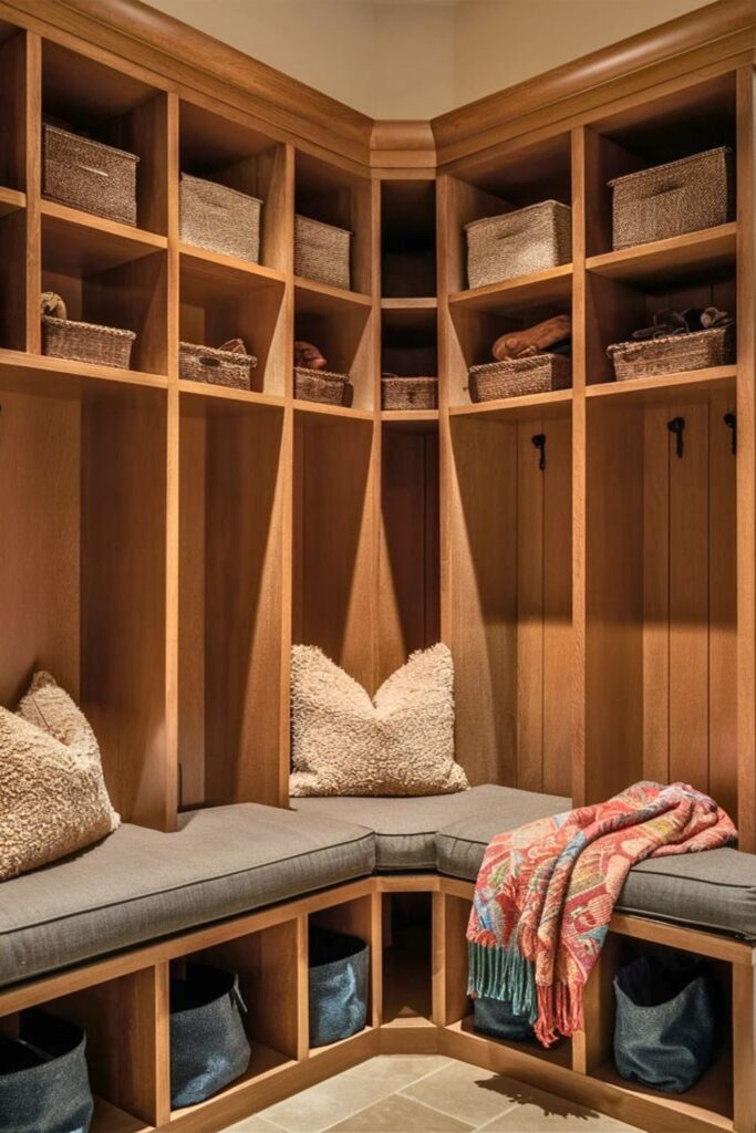 Maximize your mudroom’s corner space with a wraparound bench. This design provides generous seating and optimizes overlooked areas.
