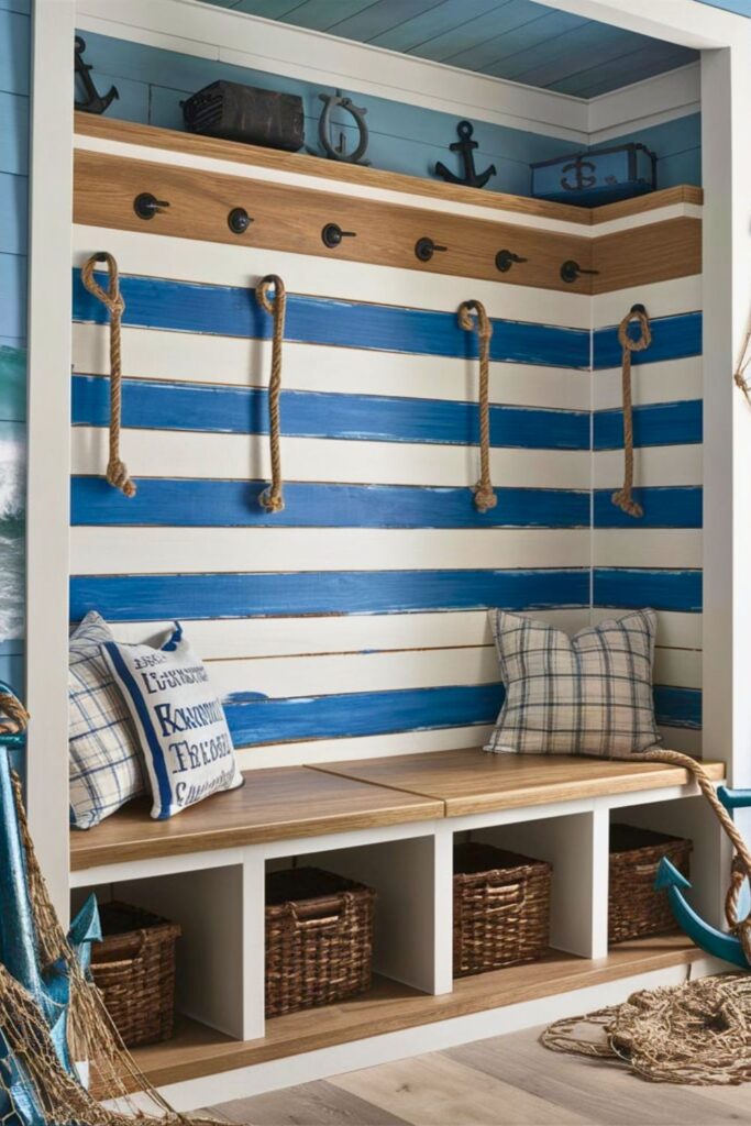 Consider adding rope handles to drawers or storage bins beneath the bench for a maritime touch.