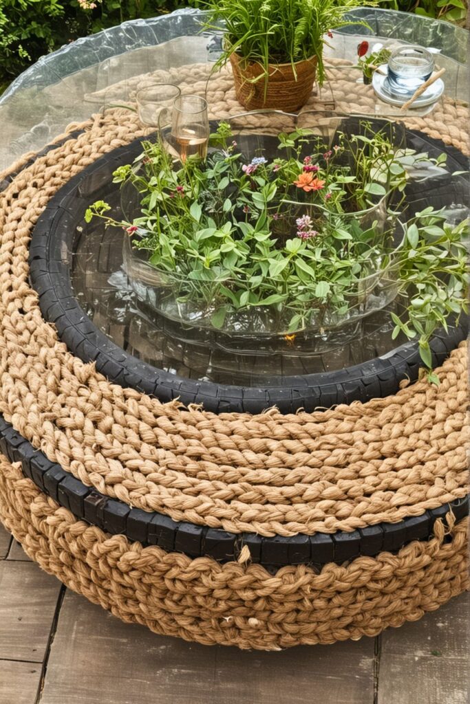To create a stunning and durable tire table, you will need a large tire, a circular glass or wooden tabletop, rope or jute, glue, sandpaper and clear outdoor sealant.