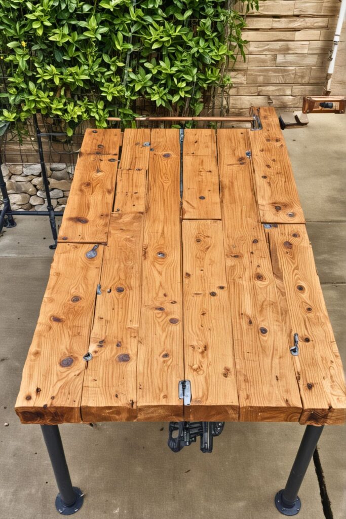 Once the planks are dry, attach them to the metal pipes to form the tabletop. Now, apply a clear outdoor sealant over the entire table to ensure it is well-protected from the elements.